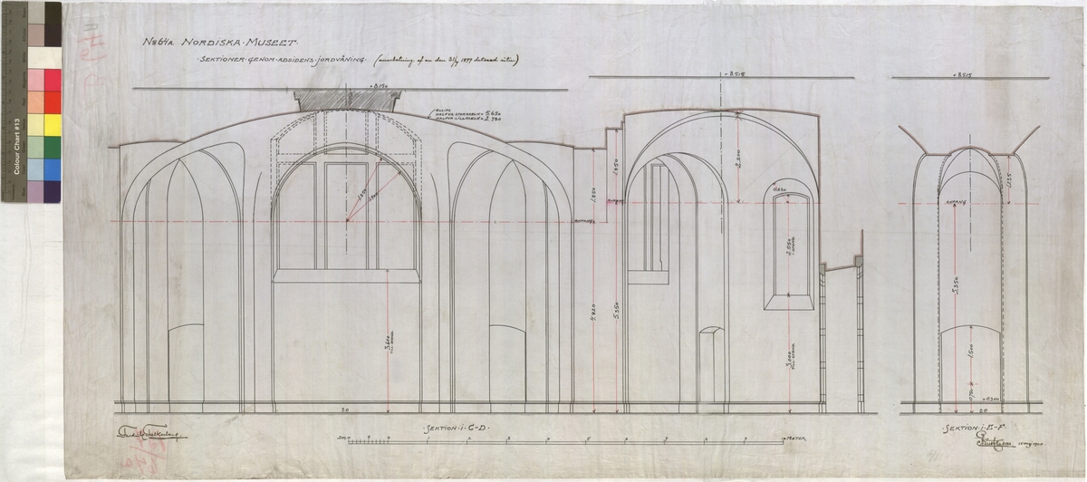 No 64 a Nordiska museet. Sektioner genom absidens jordvåning (omarbetning af den 31/7 1899 daterad ritning)