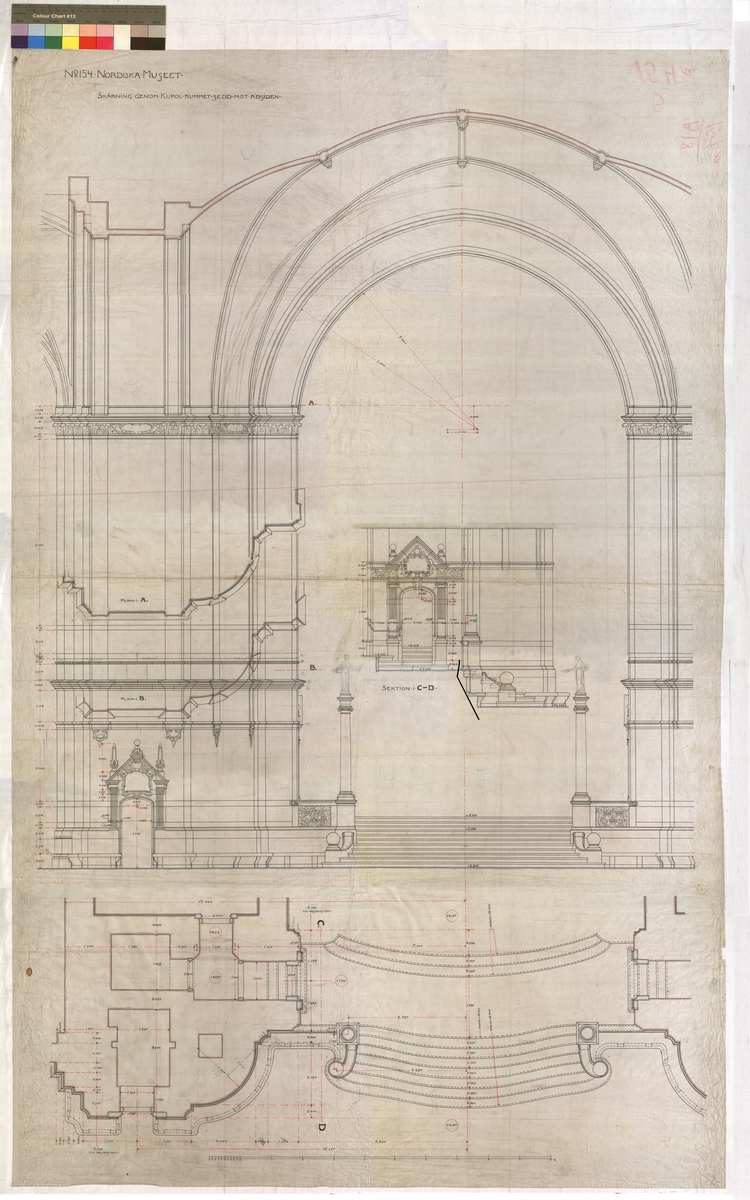 No 154. Nordiska Museet. Skärning genom kupolrummet sedd mot absiden.