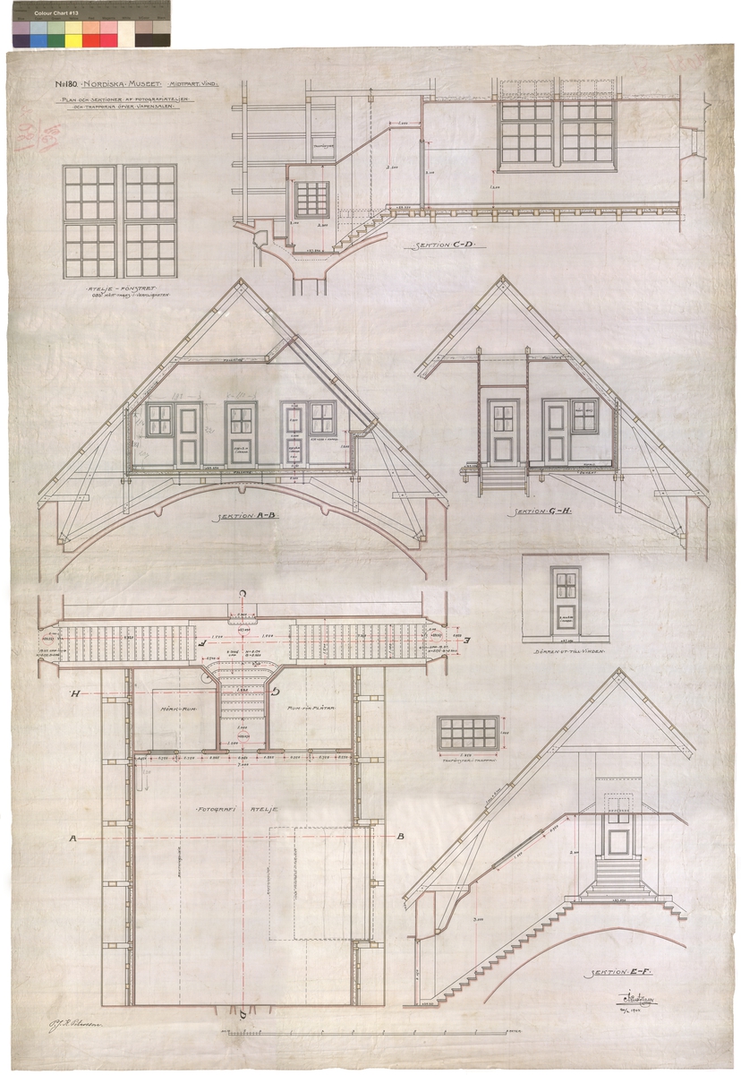 No 180. Nordiska Museet. Midtpart. Vind. Plan och sektioner af fotografiateljen och trapporna öfver vapensalen. Ateljefönstret. Fyllning. Mörkrum.Rum för plåtar. Dörren ut till vinden.Fotografi atelje
