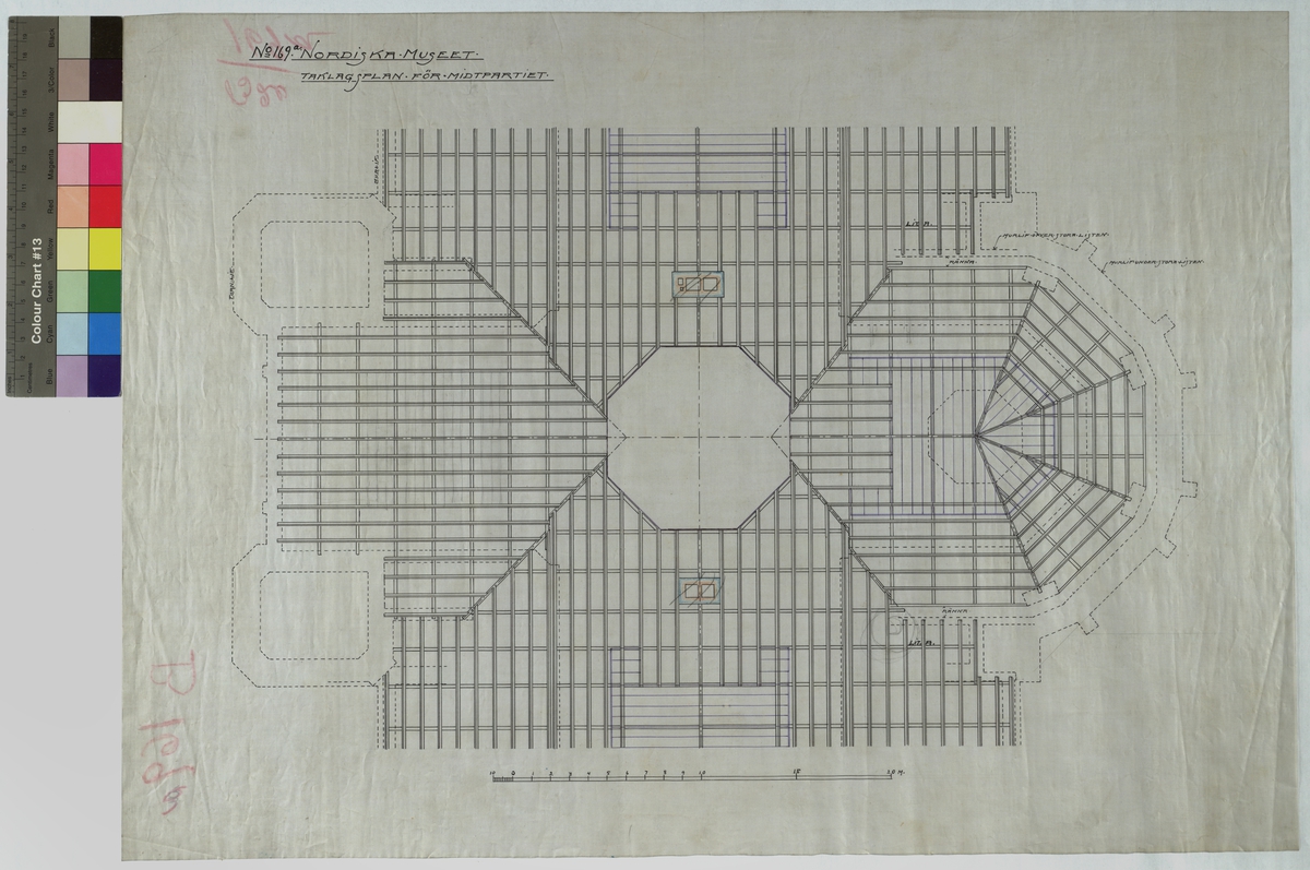 No 169 a Nordiska Museet. Taklagsplan för Midtpartiet. Murlif under stora listen. Murlif öfver stora listen.