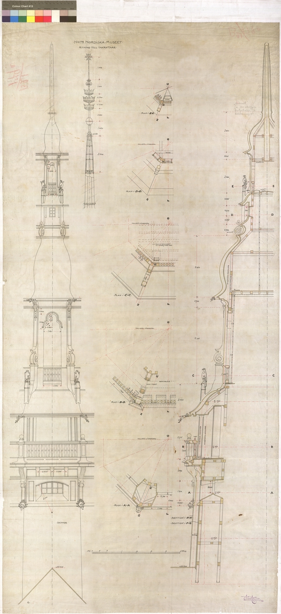 No 179. Nordiska Museet. Ritning till takryttare. Ändrat se den skuggade konturteckn å kalkerpapper.