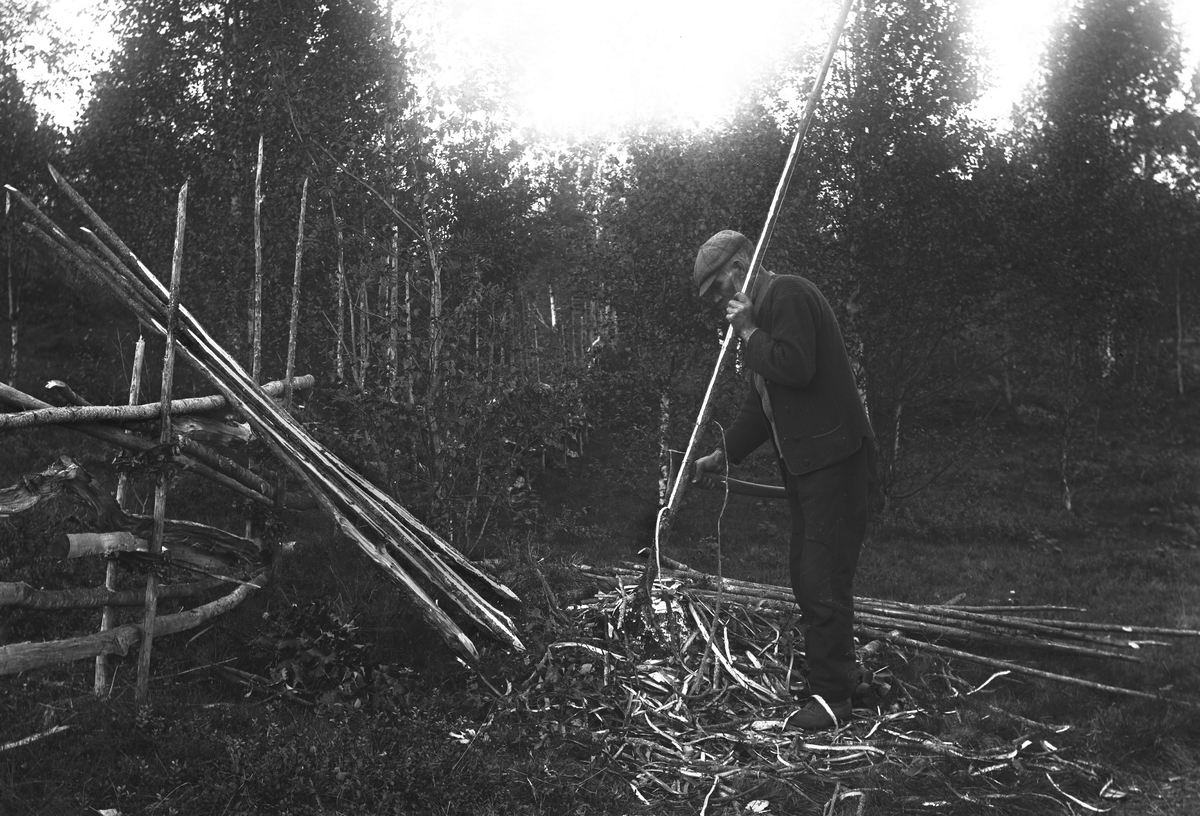 "Värmland. Jösse hd. Mangskog sn. Bjurbäcken. Barkning av gärdsgårdsstör."