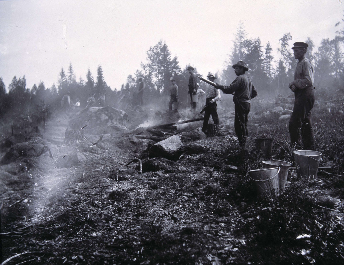 Titel: Svedjelandsbränning. Elden har gått ut, och mycket folk har samlats för att begränsa den. Värmland, Jösse härad, Mangskog socken, Slobyn.