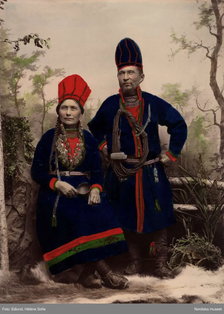 "Hustru Inga Åren. Frostviken, Lappland. Nejla Macka Åren. Frostviken, Lappland." Samiskt par. Handkolorerat ateljéporträtt i helfigur.