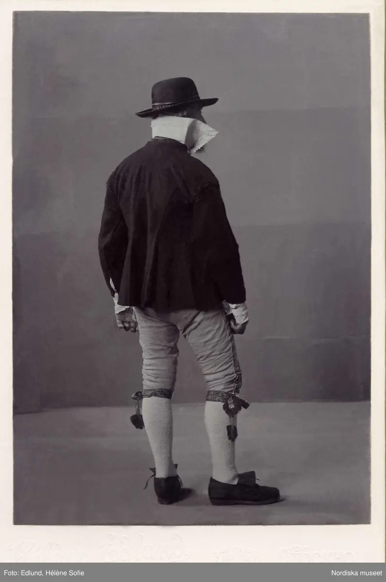 Skäggig man iklädd folkdräkt med knäbyxor, jacka och hatt. Folkdräkt från Herrestads härad i Skåne 1820 - talet.
