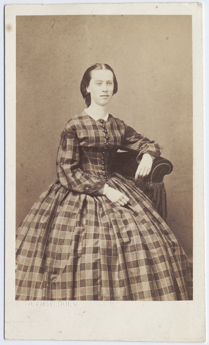 Kabinettkort. Porträtt, knästycke, av sittande ung kvinna. Hon är iklädd lång rutig klänning med vid kjol, vit krage, knäppt liv och snörmakerier vid manschett och axel.