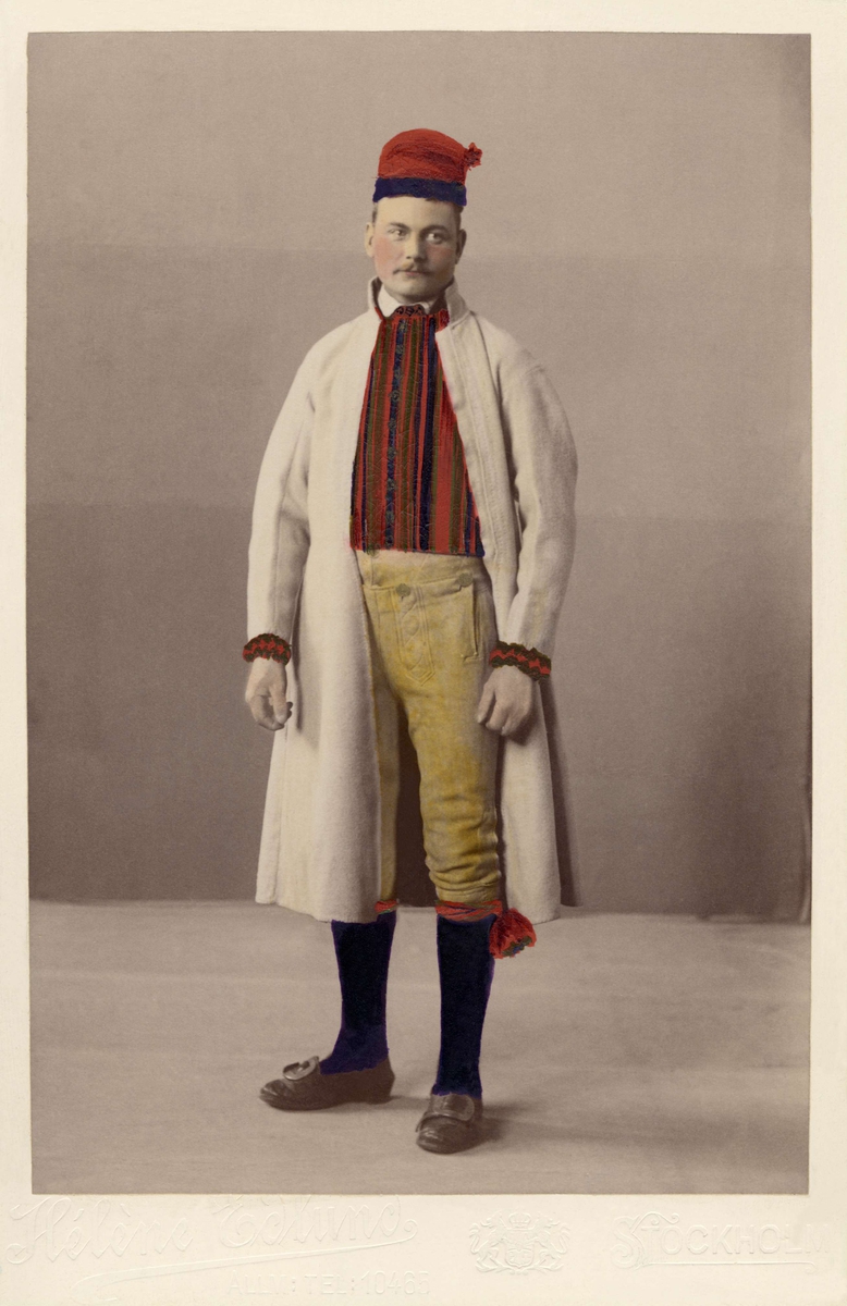 #Kyrkdräkt sommar Nås sn Dalarna 1870. " (247 M. i) skjortkragen broderad med rödt. Röd halsklut av ylle med svarta figurer på, blå strumpa, svart botten ärmsnoddar, mössan, tofsen röd ytterst