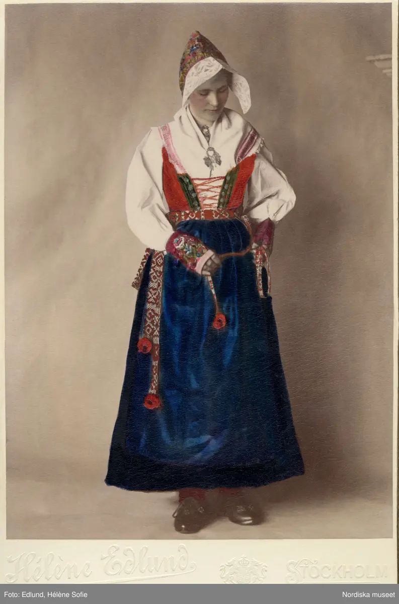 Porträtt av kvinna klädd i Åls högtids- och kyrkodräkt, Dalarna, Nedan Siljans fögderi. Handkolorerat fotografi.
