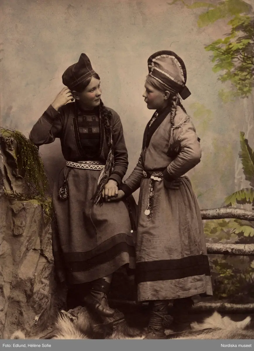 Två samiska kvinnor. Handkolorerat ateljéporträtt i helfigur.