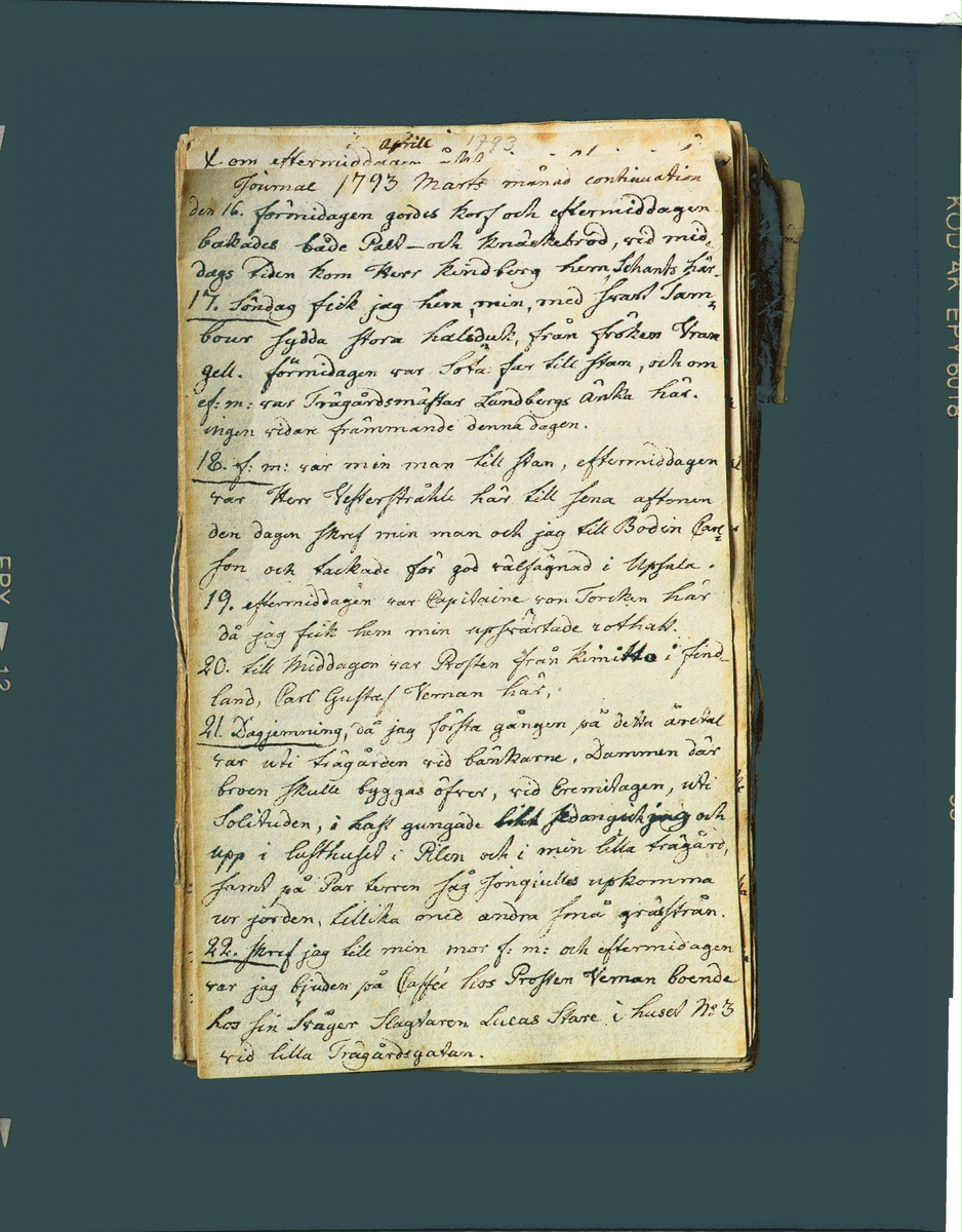 Dagboksanteckningar. Närbild på en av de handskrivna sidorna i Märta Helena Reenstiernas, även kallad Årstafrun, dagbok. Anteckningarna är från 16 till och med 22 mars 1793