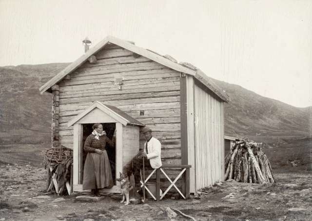 Lapphärbärget vid stationen Sylstugan., exteriör. Stugudahl med hustru och hund utanför stugan.
