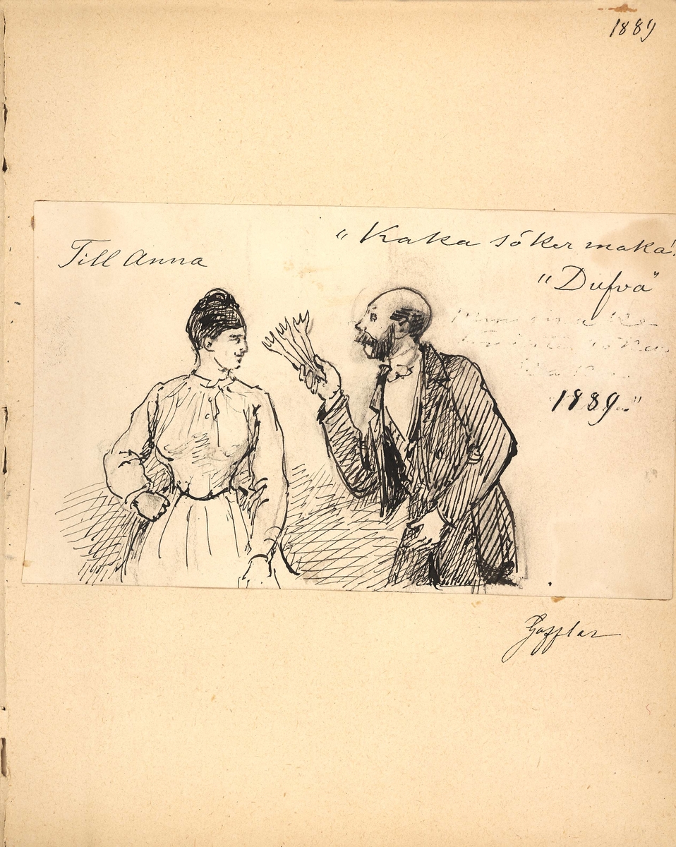 Teckning. "Till Anna. Kaka söker maka! 'Dufva' 1889. Gafflar."
