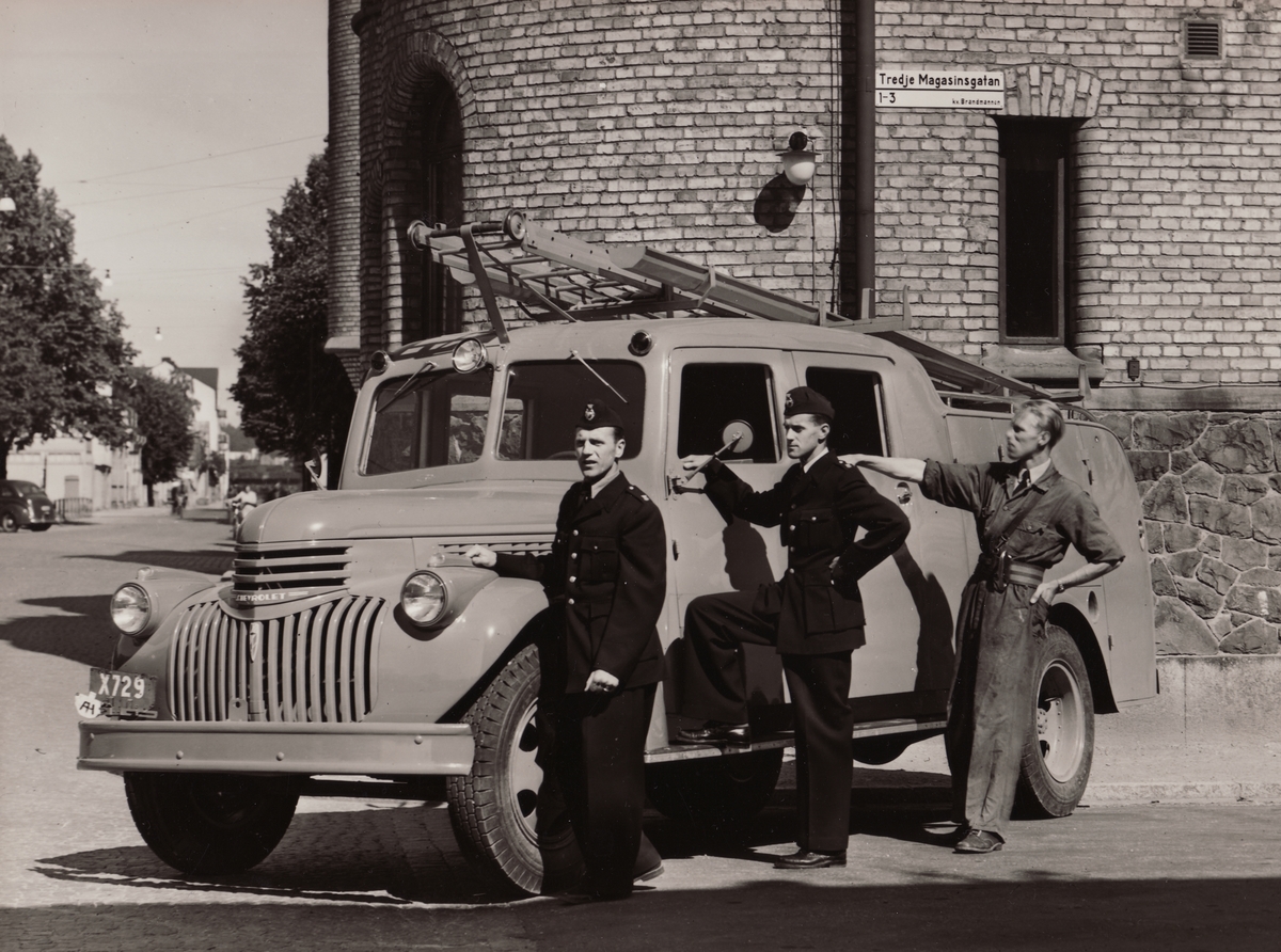 General Motors Nordiska Ab. "En ny brandbil har levererats till Fagersta Bruks AB:s brandkår i Forsbacka. Bilen har levererats av Bröderna Hansson i Gävle. Brandmännen heter Henry Eriksson, Gösta Bergkvist och Ingvar Bengtsson, från vänster till höger. Fotot togs av Hovfoto Carl Larsson."