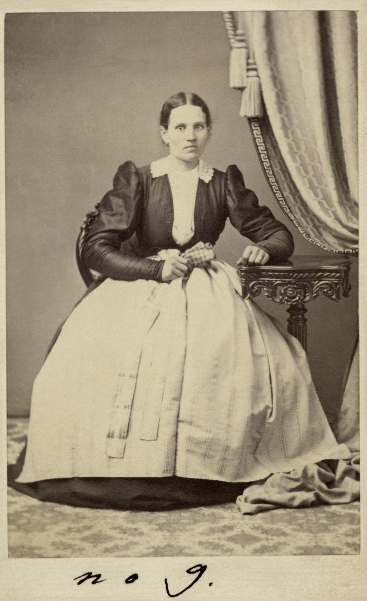Kvinna sitter vid ett bord, poserar i en vid klänning