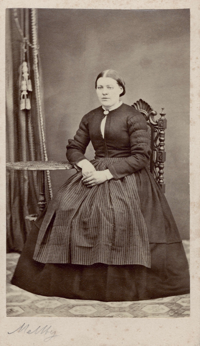 Porträtt av kvinna i en långärmad klänning och randigt förkläde sittande intill litet pelarbord. Mellby. Nordiska museet inv.nr. 18533A.