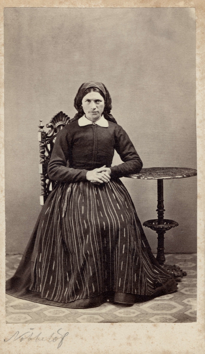 En kvinna sitter klädd i folkdräkt