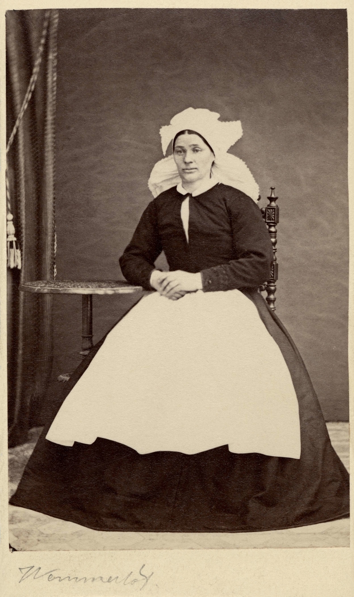 En kvinna poserar i folkdräkt, med vitt förkläde och vit schalett