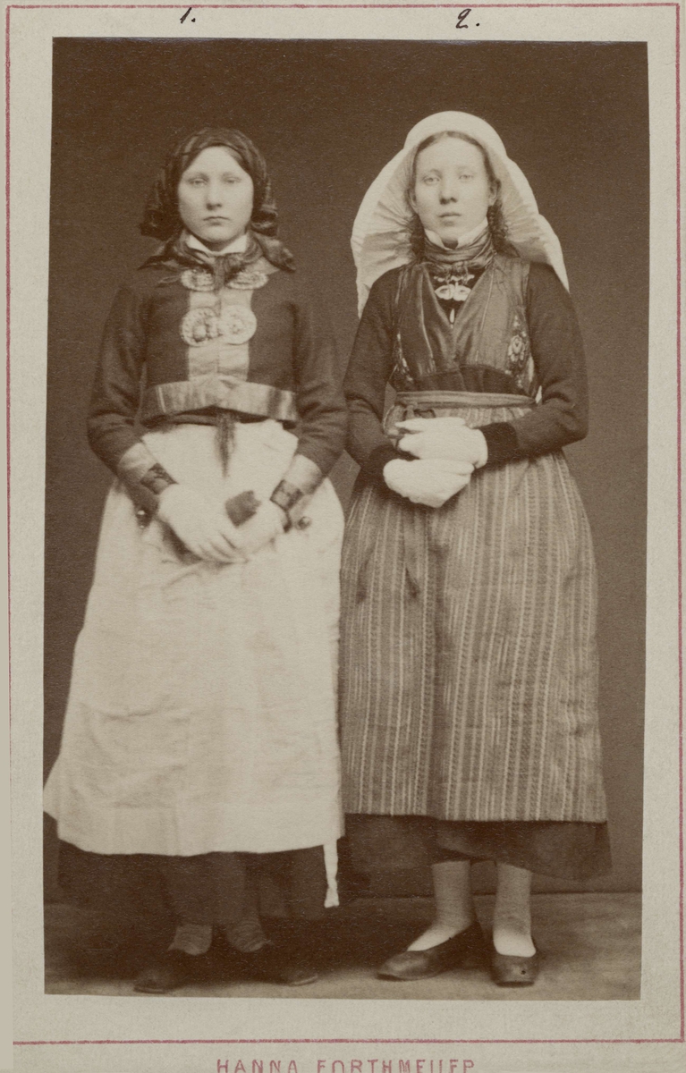 Bondflicka och bondkvinna från Harjagers härad, Skåne iklädda sockendräkt. Inv.nr. 18685.