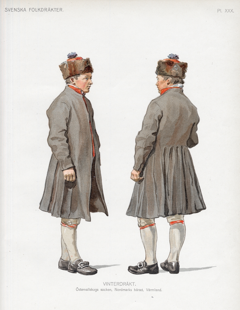 Akvarell föreställande man iklädd sommardräkt från Östervallskogs socken, Nordmarks härad i Värmland, sedd både framifrån och bakifrån.