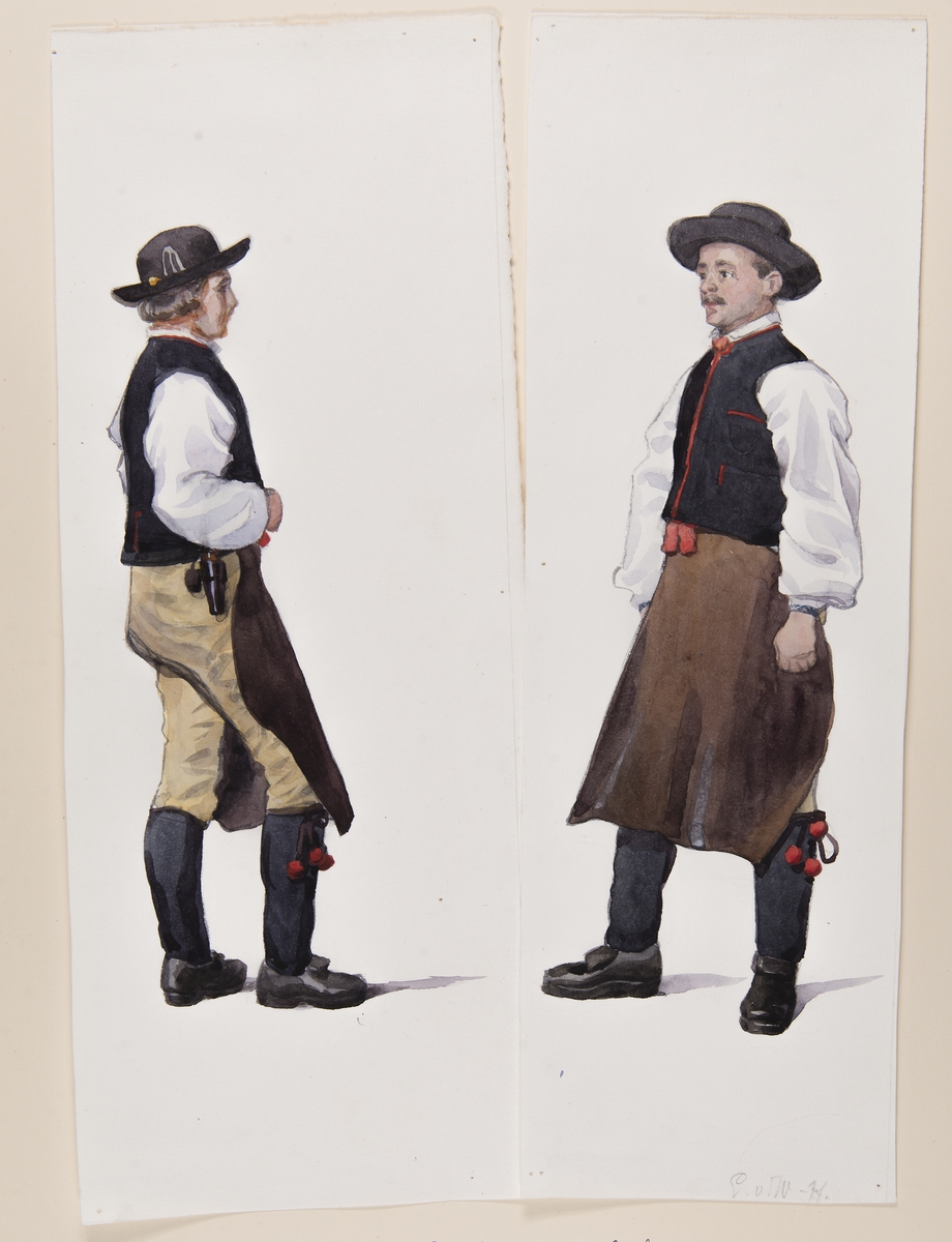 Två män i Rättviksdräkt Akvareller av Emelie von Walterstorff.