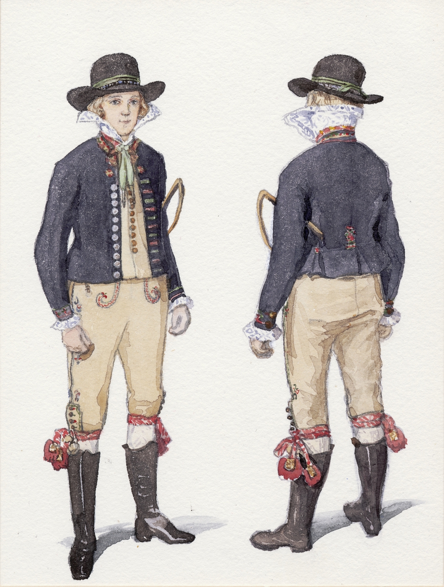 Akvarell av E. von Walterstorff föreställande ung man iklädd folkdräkt, festdräkt, från Herrestads härad i Skåne.