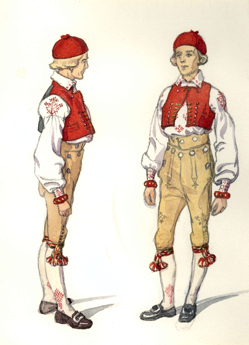 Folkdräkt, söndagseftermiddagsdräkt, Ny socken, Värmland. Mansdräkt. Akvarell av Emelie von Walterstorff.