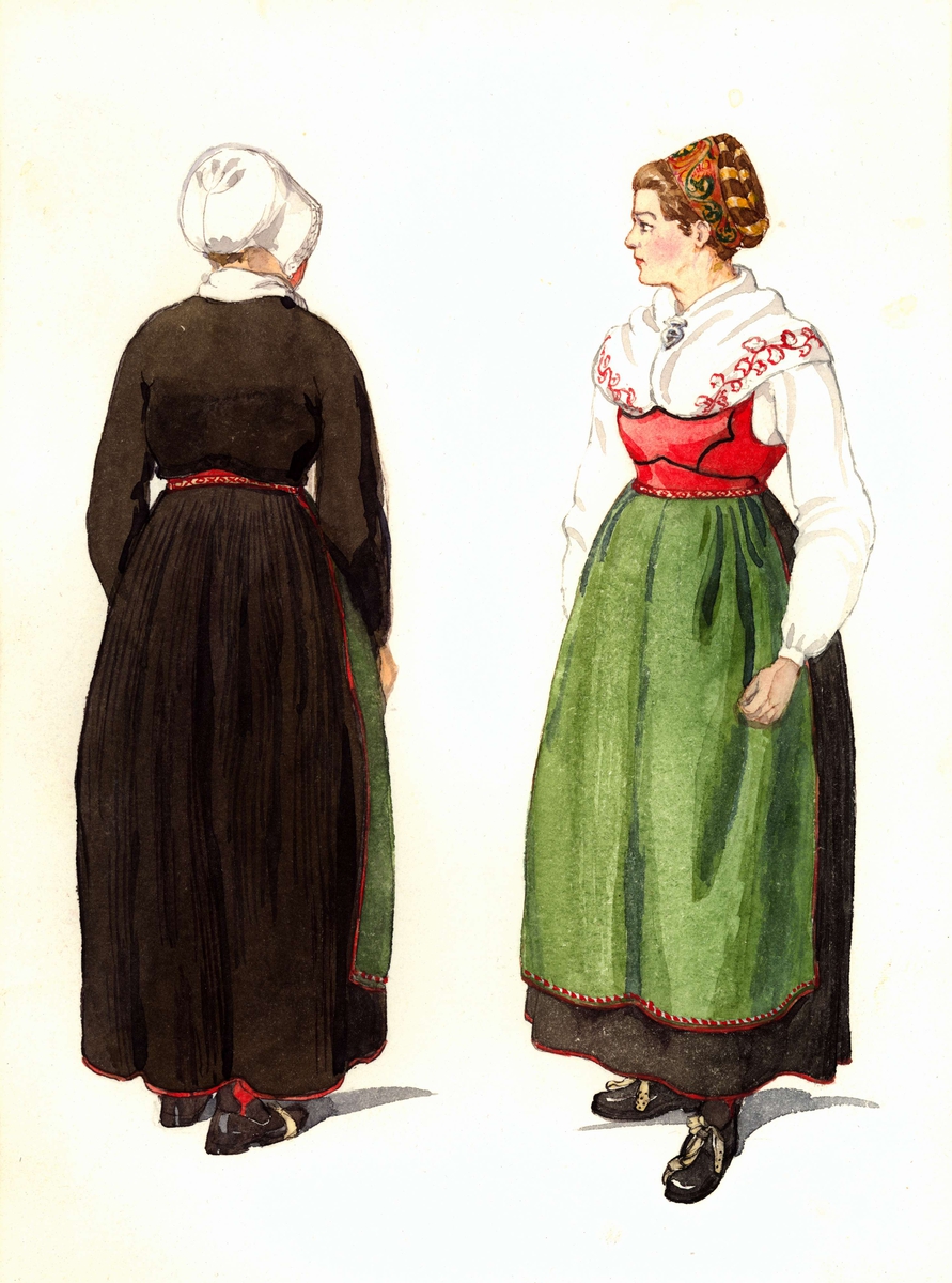 Folkdräkt, helgdagsdräkt, Ny socken, Värmland. Kvinnodräkt. Akvarell av Emelie von Walterstorff.