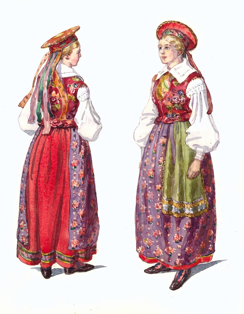 Kvinnodräkt, Medelstads härad, Blekinge. Akvarell av Emelie von Walterstorff.