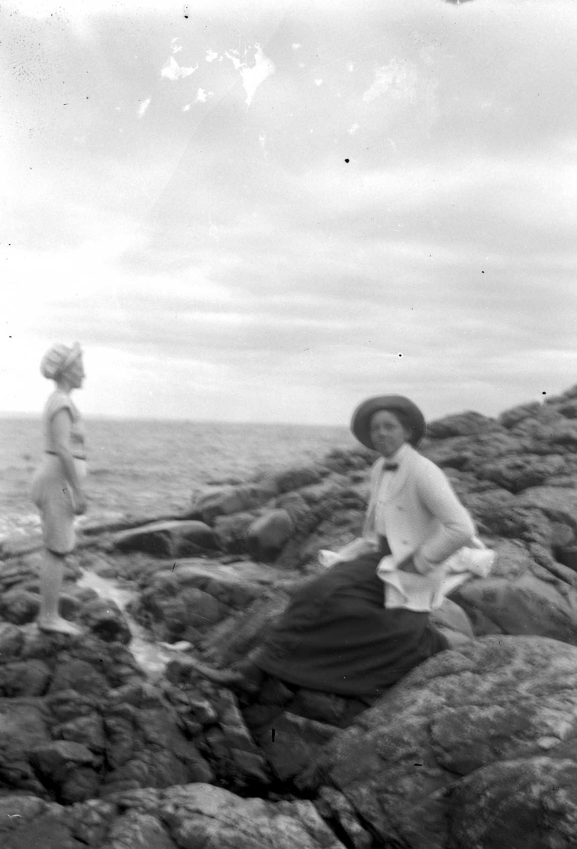 Porträtt av en kvinna i vit kavaj och svart kjol som sitter på en klippa. Till vänster står en kvinna i baddräkt och badmössa.