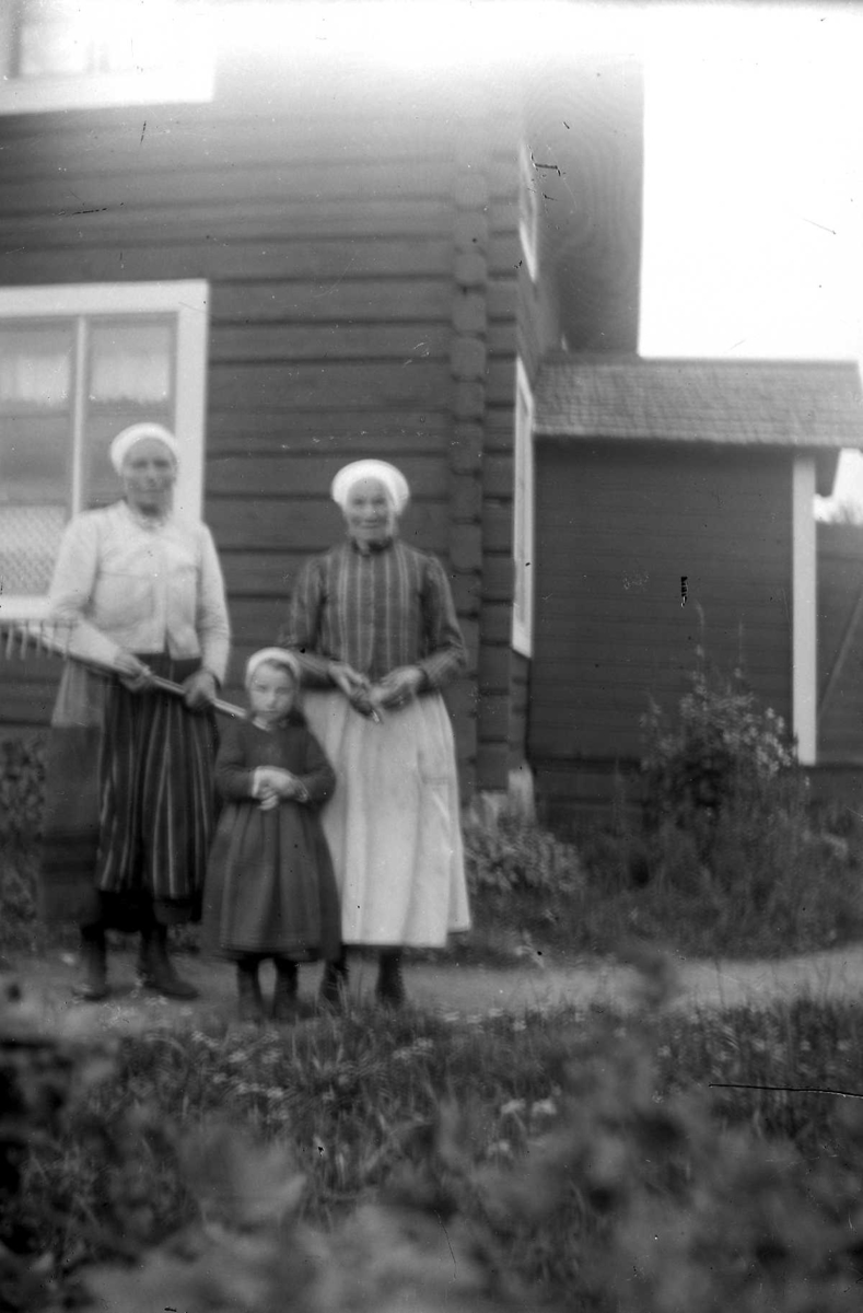 Gruppbild av två kvinnor och en flicka iframför ett knuttimrat hus. Den ena kvinnan håller en brödspade i handen.