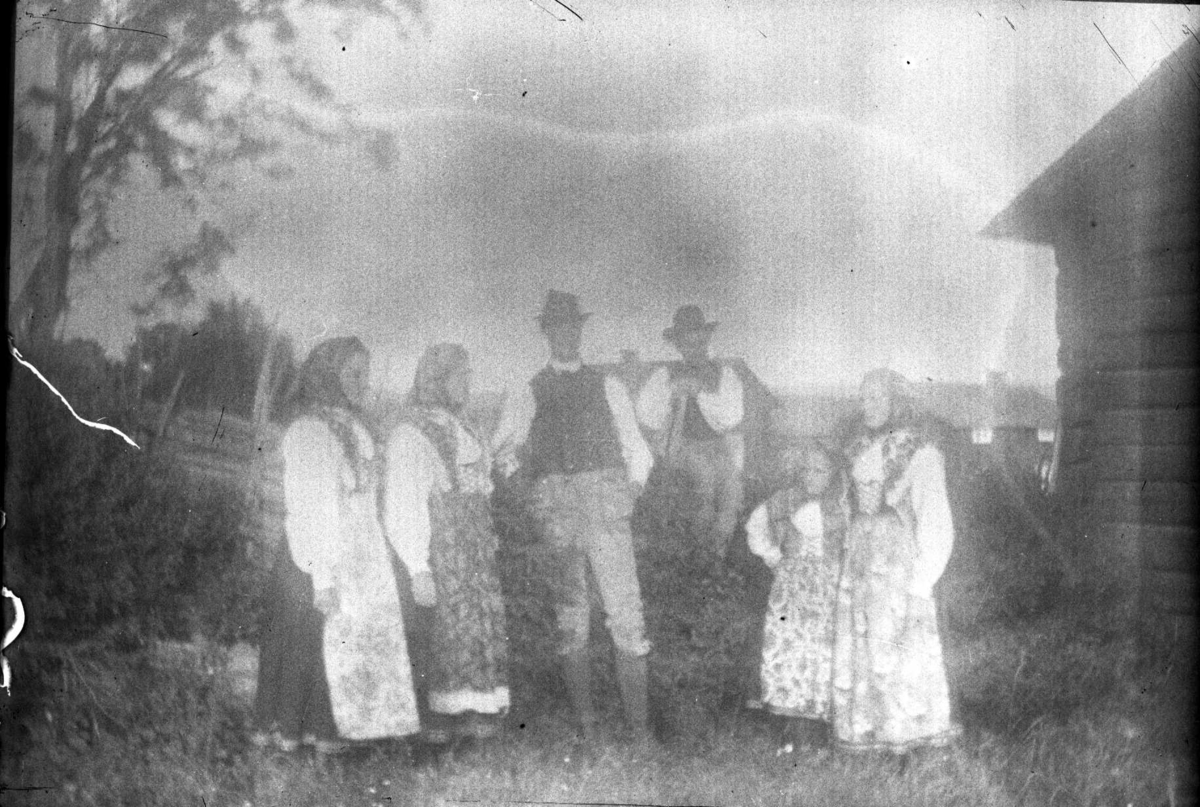 Gruppbild av ett sällskap i folkdräkter vid en knuttimrad byggnad.