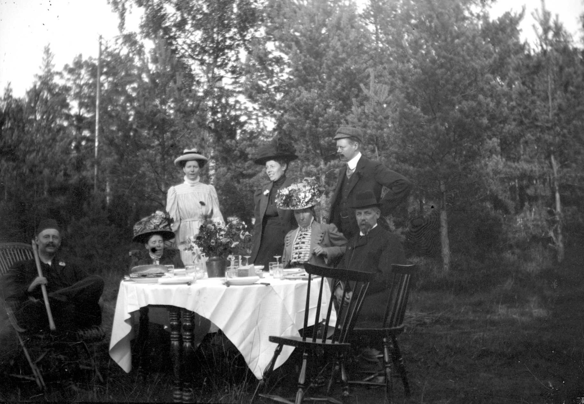 Gruppbild av ett sällskap kring ett dukat bord i trädgården.