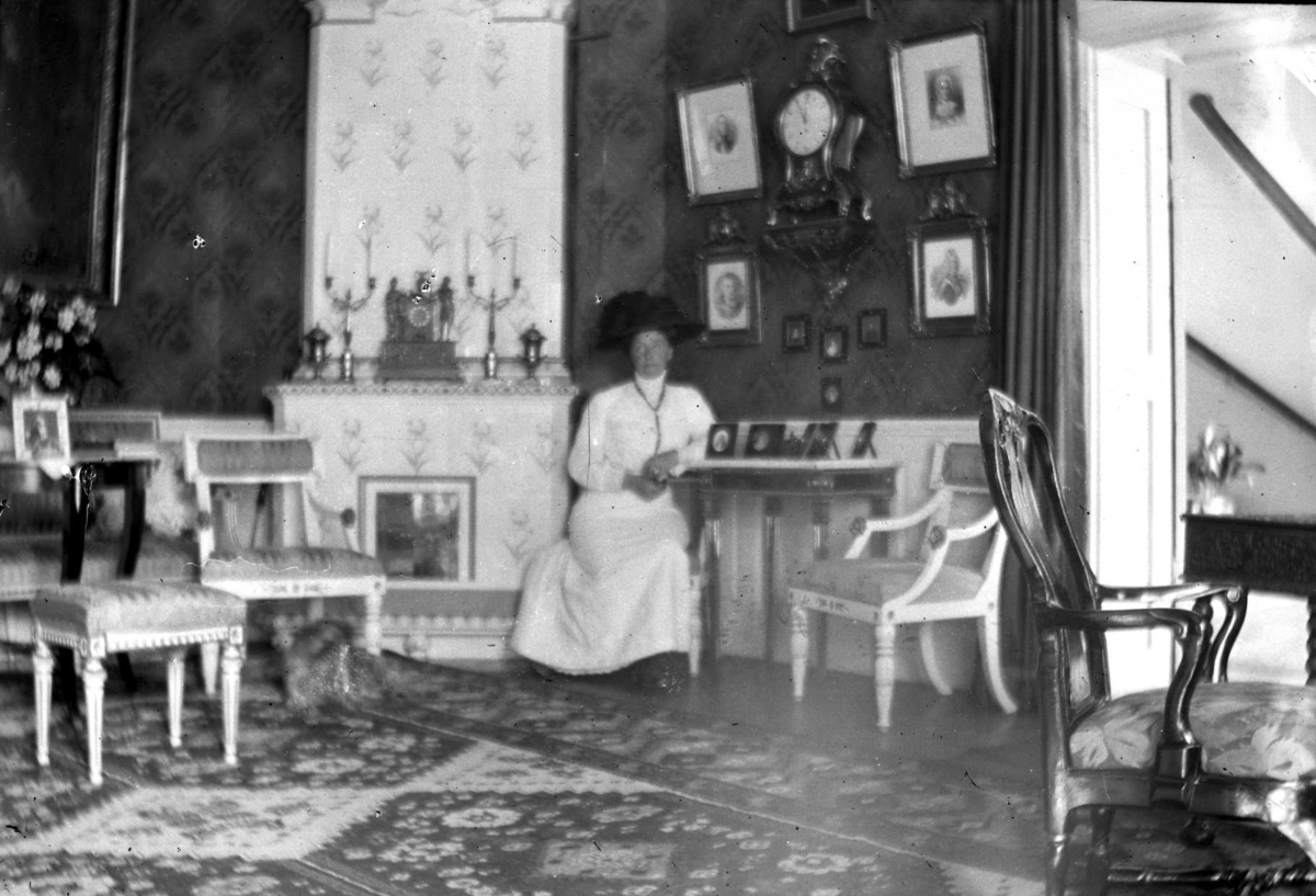 Porträtt av en kvinna i vit klänning och svart hatt i en salongsinteriör.