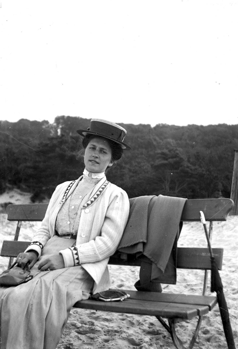 Porträtt av en kvinna sittande på en bänk i utkanten av ett dynlandskap.