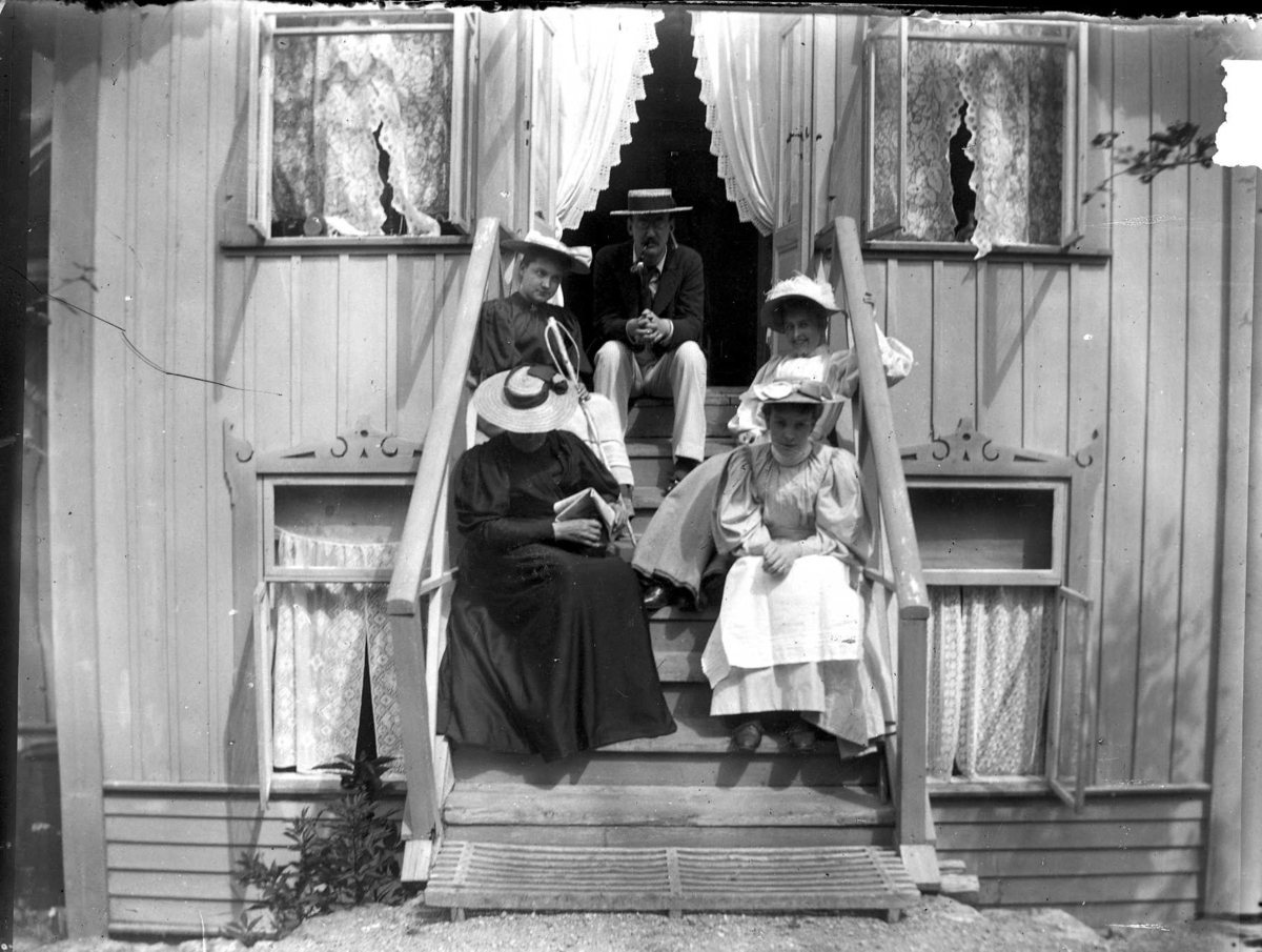Gruppbild. Ett sällskap sitter på en trappa.