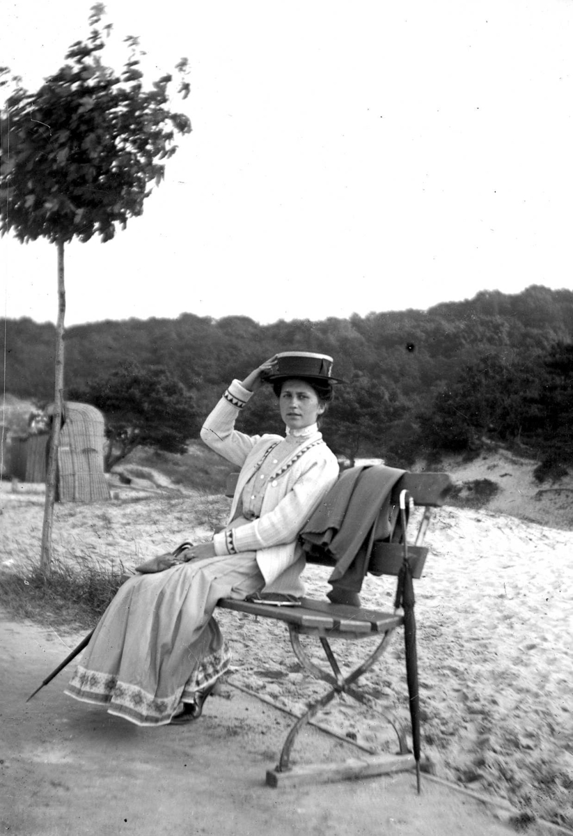Porträtt av en kvinna sittande på en bänk i utkanten av ett dynlandskap. Till vänster skymtar en flätad badhytt.