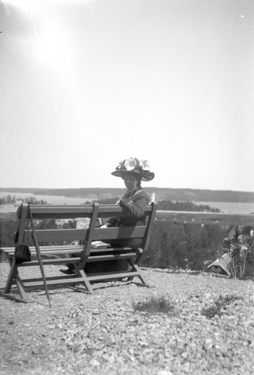 En kvinna med stor hatt med blommor sittande på en bänk.