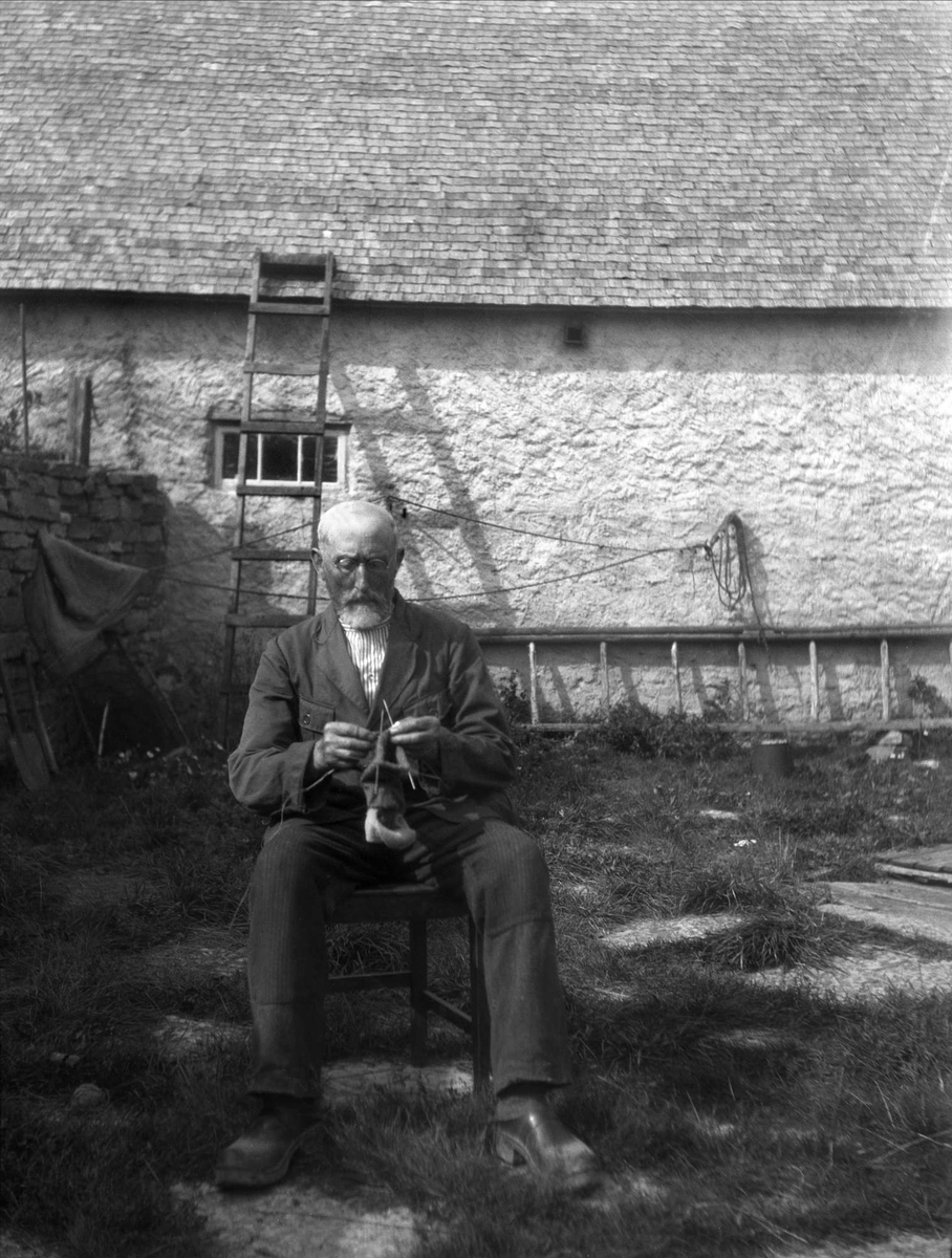 Stickning. En man sitter på en pall och stickar. Gräsgård, Öland.