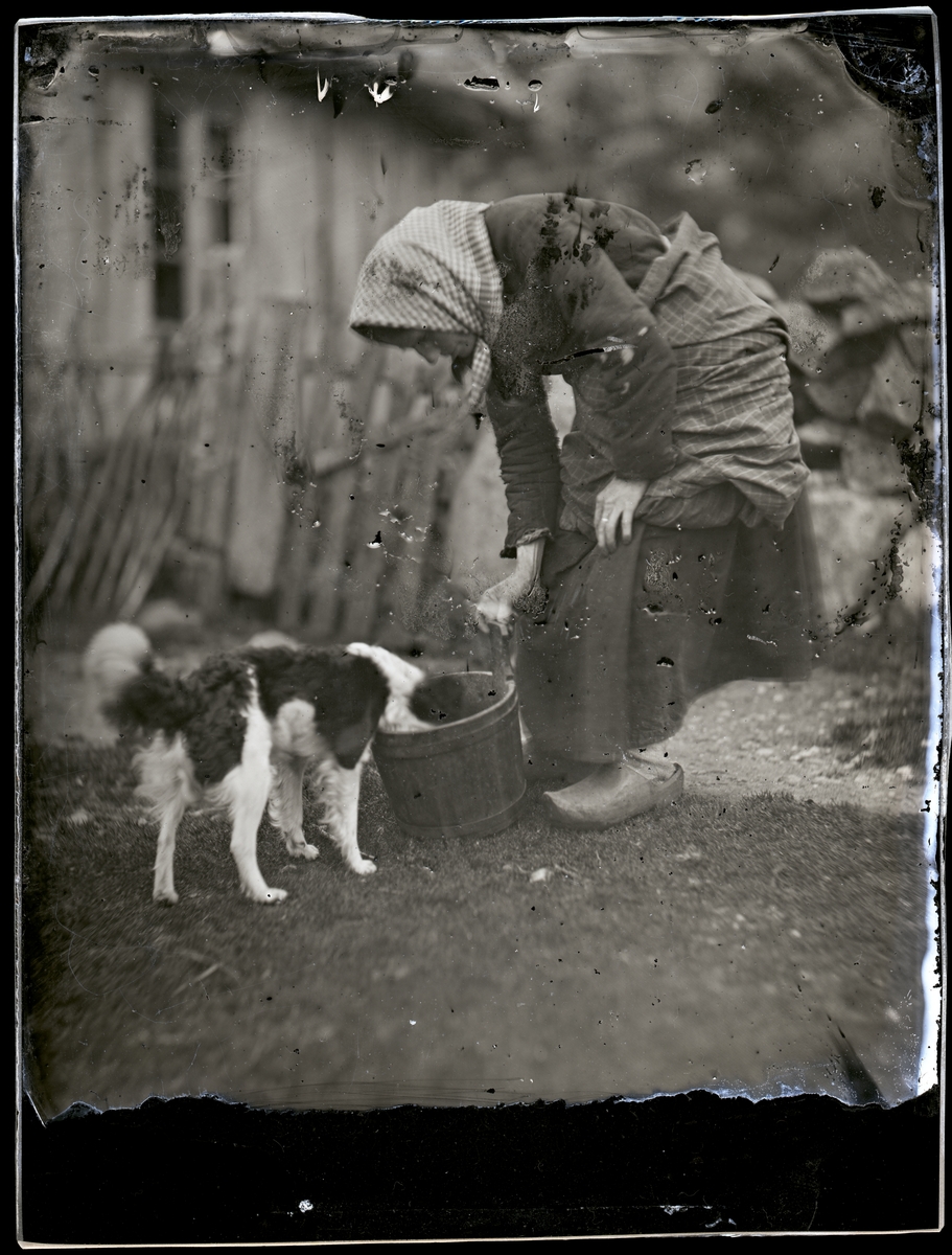 En kvinna i huvudkläde och träskor matar sin hund ur en hink