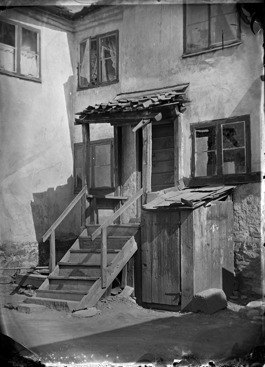 Trätrappa upp mot ett hus i fattig slummiljö.