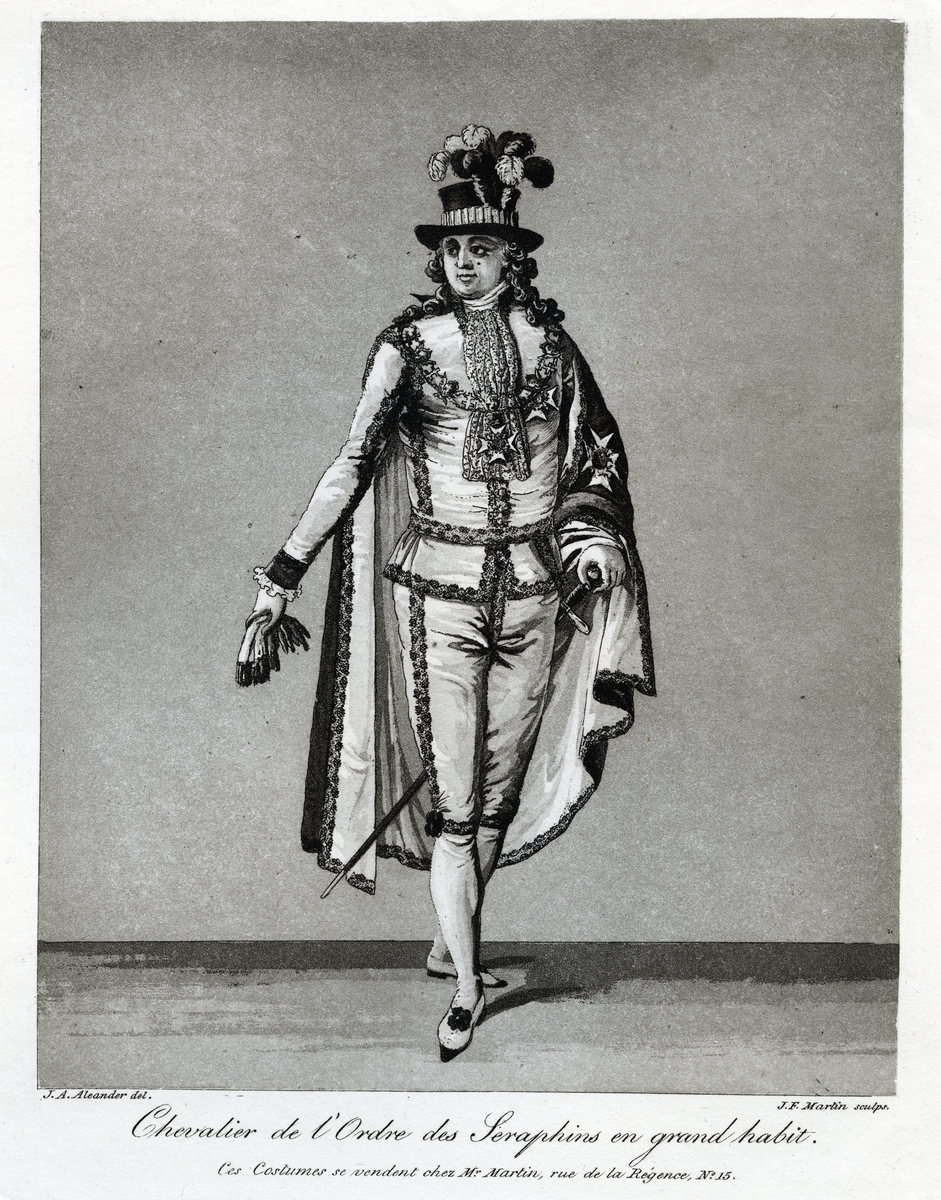 "Chevalier de l'Ordre des Seraphins en grand habit." Stora Serafimerdräkten. Akvatint av J F Martin efter teckning av J A Aleander, trol. 1780-tal.