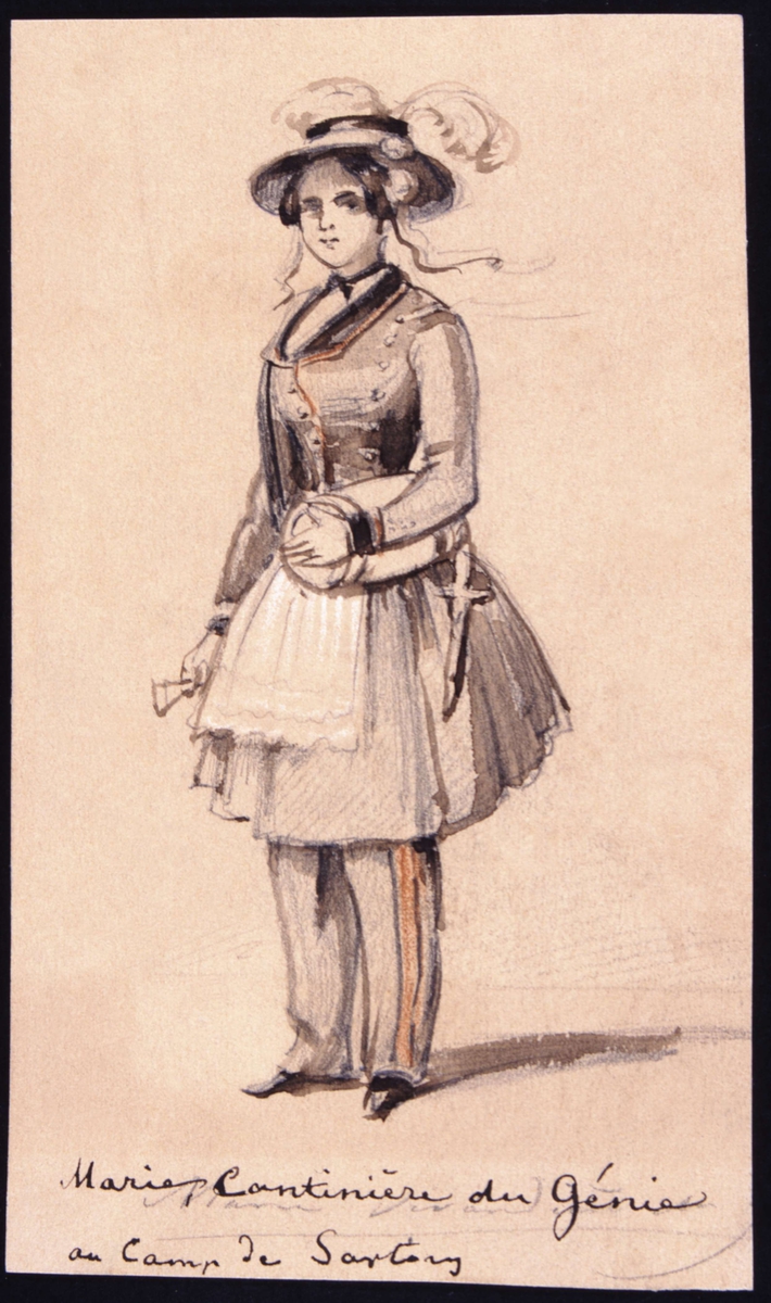 "Marie, Cantiniére du genie au camp de Sartory." Akvarell av Fritz von Dardel, Marketenterska i uniform vid miltärlägret Sartory i Frankrike, med kagge och spetsglas.