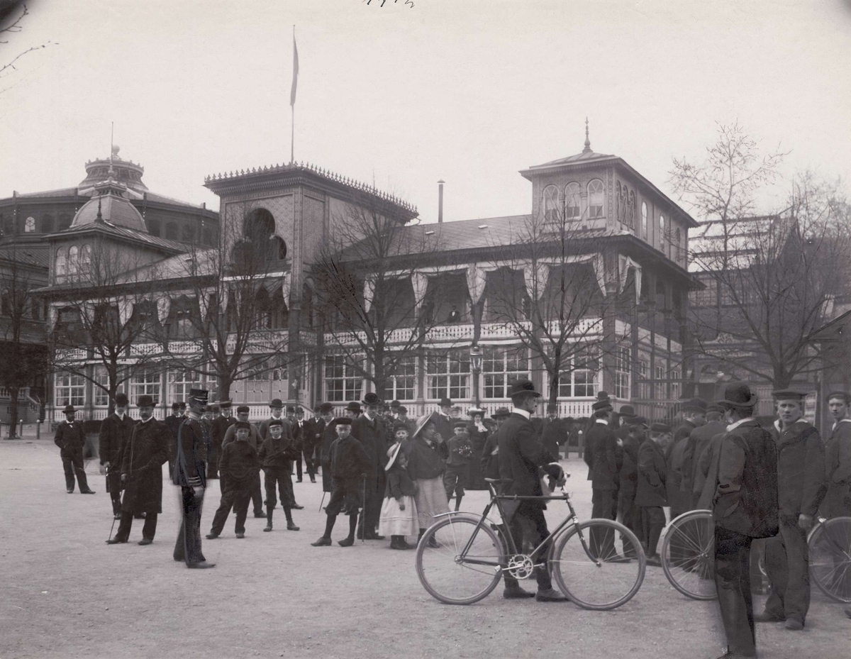 Alhambra, restaurang och teater, på Djurgårdsslätten, Djurgården, Stockholm. Uppfört av hovkonditor Pohl omkring 1830. Även kallat Pohlsro. Byggnadens fasad i bakgrunden. En folksamling - män, barn, kvinnor, cyklar mm står framför på grusplanen.