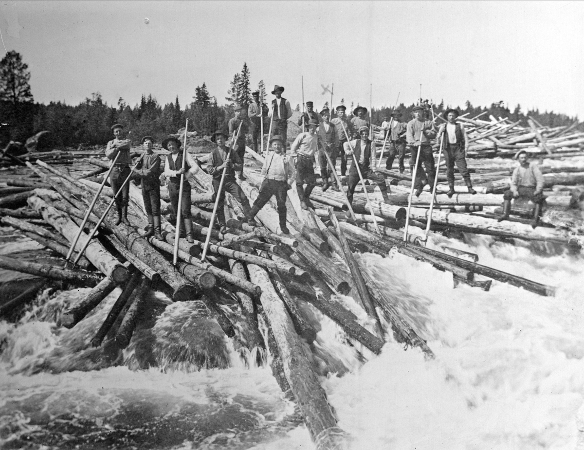 Timmerflottare, Haverö socken, Medelpad. Slutrensning ("rumpning") av timret, som fastnat på stenar då vattenståndet sjunkit.