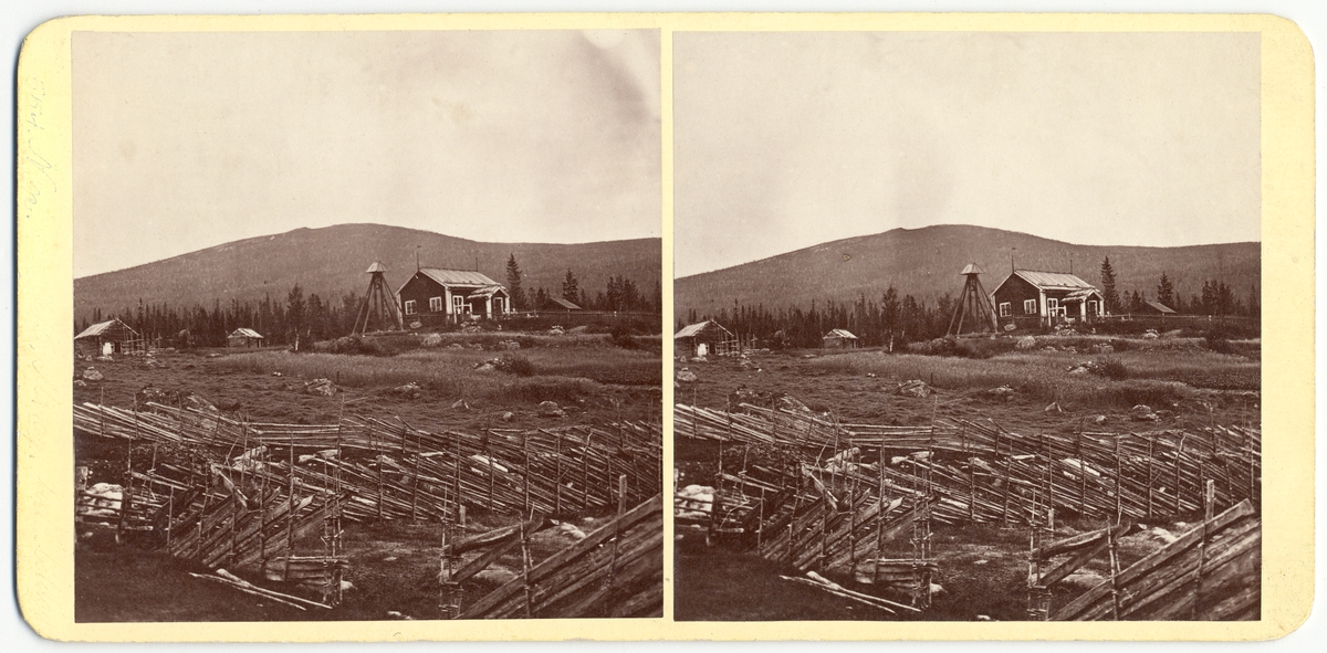 Stereoskopbilder med vy över Lappländskt landskap. Kvikkjokks kapell med klockstapel bakom gärdesgård.