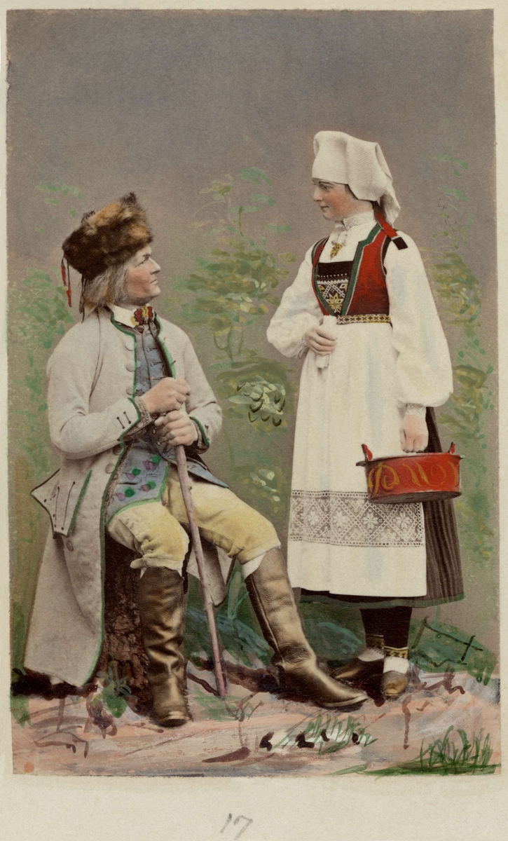 Dräktdockor med huvuden skulpterade av C A Söderman, visade på världsutställningen i Paris 1867. Man från Gudbrandsdalen och kvinna från Hardanger, Norge. Handkolorerad.