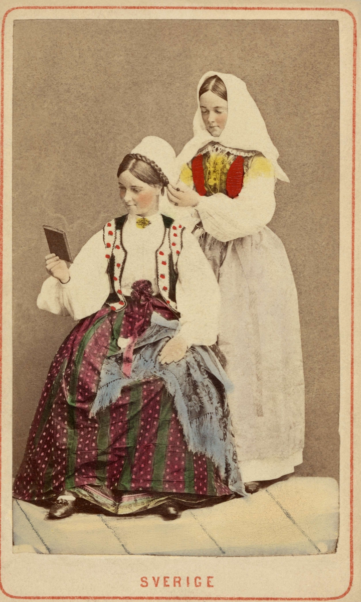 Dräktdockor med huvuden skulpterade av C A Söderman, visade på världsutställningen i Paris 1867. Två kvinnor i folkdräkter från Blekinge, varav en hjälper den andra med huvudbonaden. Handkolorerad version.