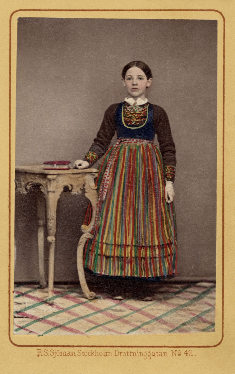 Porträtt av ung flicka iklädd sockendräkt. "Äfven något moderniserad drägt ehuru änna begagnad af den som kläda sig som bönder" (?) lyder en något otydlig påskrift bakpå fotografiet. Busjö, Herrestad i Skåne. Kolorerat i efterhand. Nordiska museet inv.nr. 18536F.