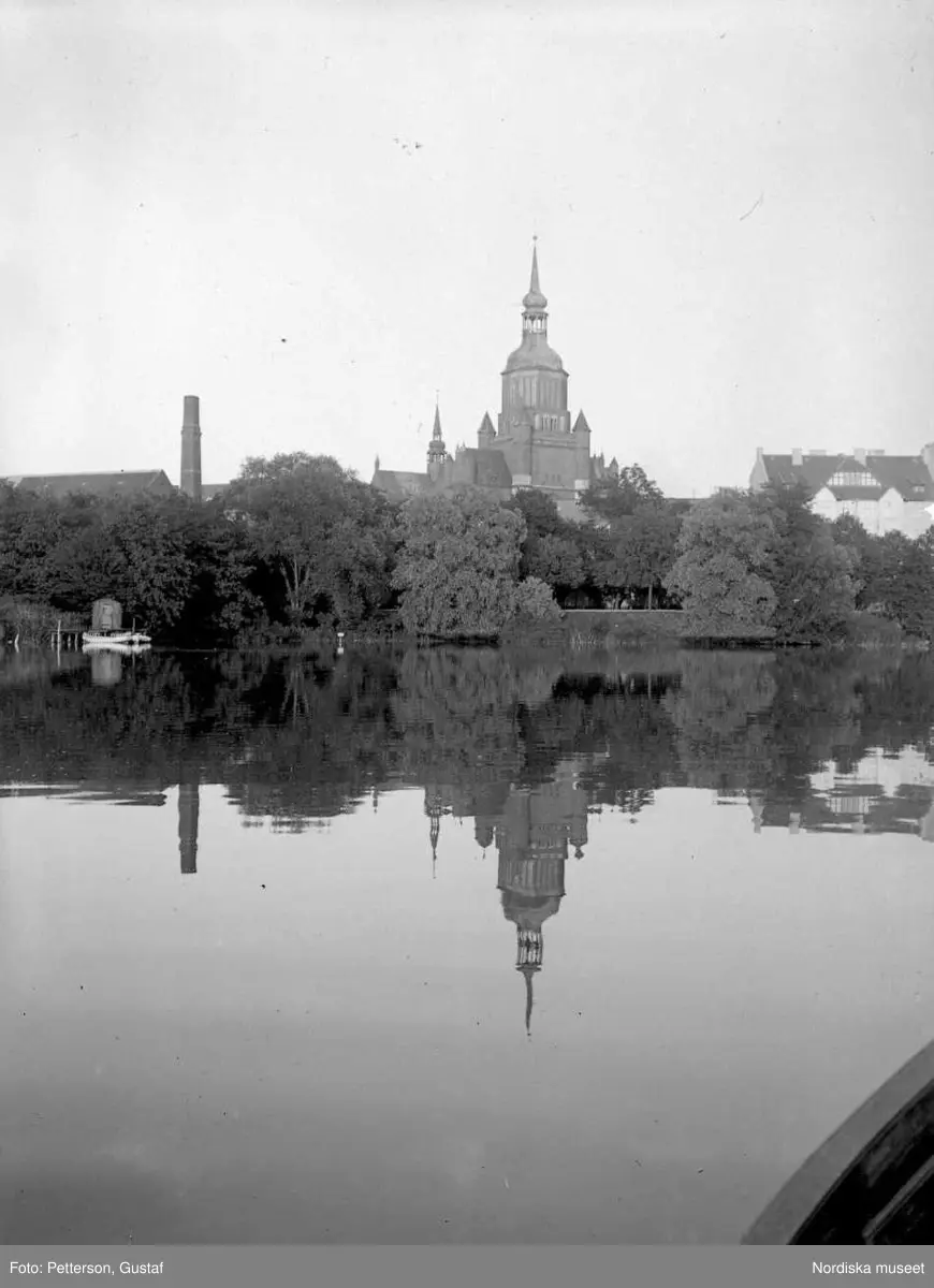 Vy från norra Tyskland. Stralsund, Marienkirche från roddbåt på Knieperteich (spegelbild).