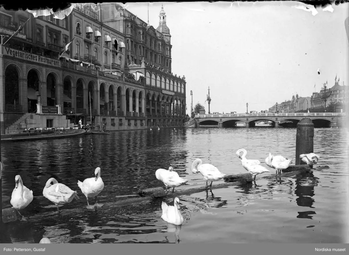 Vy från norra Tyskland, Hamburg. Alster med svanar.